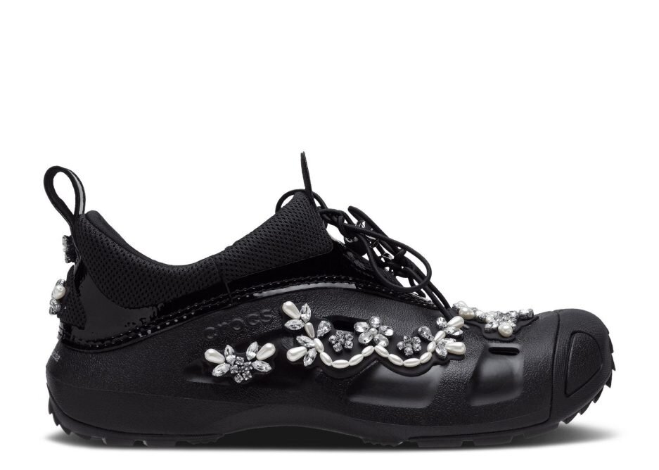 The Simone Rocha x Crocs Quick Trail Low ‘Black’ combines simple functionality with an elevated design style. The upper is made of black foam, paired with a stretchy mesh collar for a comfortable fit. Jeweled details adorn the side panels and the back of the heel, giving these slip-ons an opulent look. A heel pull tab makes for easy on and off, while vent ports keep every step breathable. A set of Jibbitz charms let you customize the look to your heart’s desire.